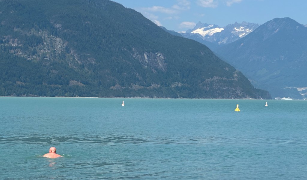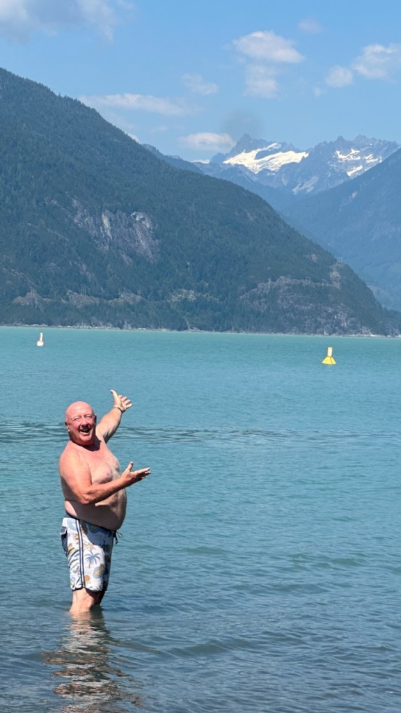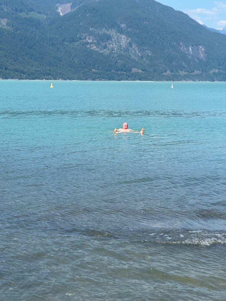 Here im training hard to finally beat my friend Pim in open water swimming , while he has it easy in the balmy Mediterrenean sea , I’m training between snow capped mountains and sub zero temperatures . Modern day Speedo! Take that BUDDY 🤣