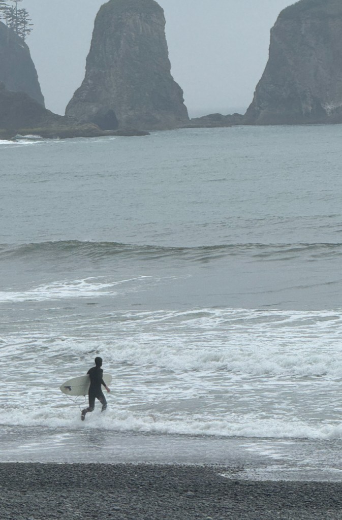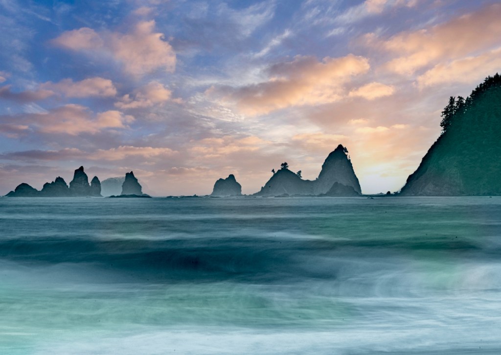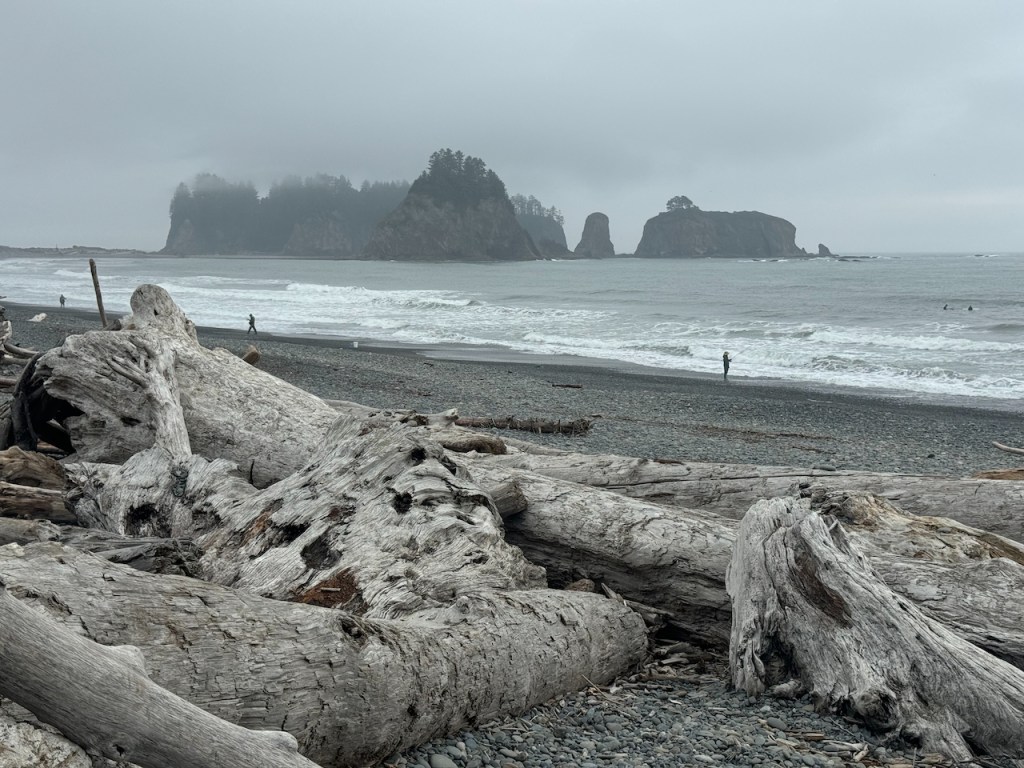 Vast, Green, Cloudy ,Different and superbly majestic. OK enough of the superlatives. This park is one of the larger national parks. Weird thing though is that you can’t drive through it . There is a road circling the park , every so many miles you can take a right if you’re going clockwise and enter a special area of the park. Dead end roads ending mostly in parking lots and the start of many trails. This is a hikers paradise , bring a tent and every day will be another spectacular hiking day with different landscapes , wildlife and ecosystems. From temperate rainforests, trees rich with moss and lychens, to beaches with Huge rock stacks , Arches and great tide pools . Lots of low hanging clouds , rain over 12 feet a year and , as is the story , many teenage vampires around the town of Forks. Alpine , snowy peaks in the center of the park to lush meadows perfect to pitch a tent and lay down to enjoy the starry nights. Or the clouds mostly.